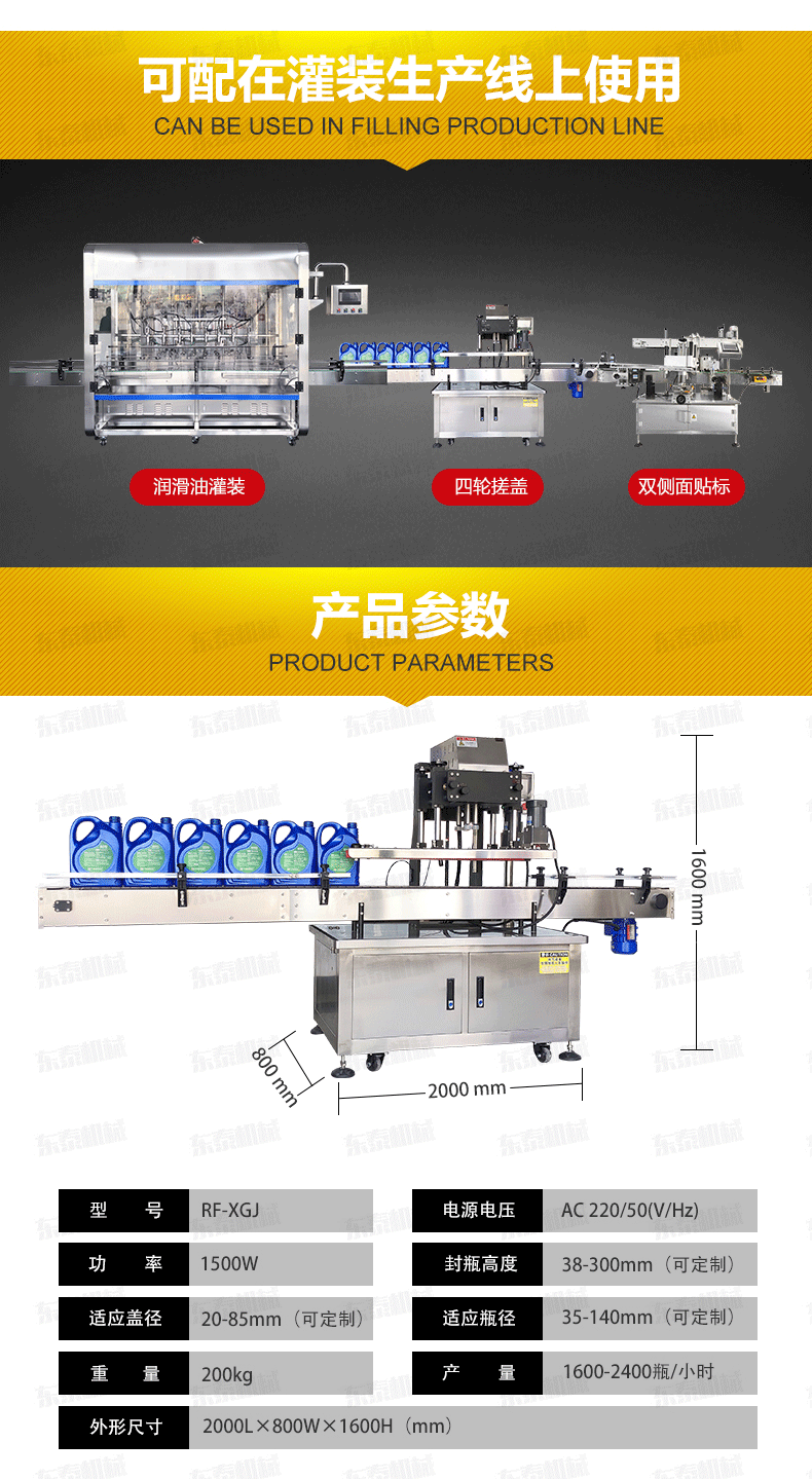 瓶、傳送、旋蓋,機器自動化程度高,穩(wěn)定性好,調(diào)節(jié)方便,更換瓶形或蓋時無須備件,只需作調(diào)整即可完成(如配上蓋機,可進行自動上蓋)可以根據(jù)實際需要選配。
