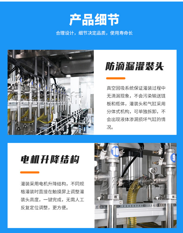 1.灌裝頭采用國(guó)家知識(shí)產(chǎn)權(quán)局認(rèn)證的實(shí)用新型:真空回吸防滴漏灌裝頭;