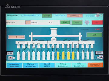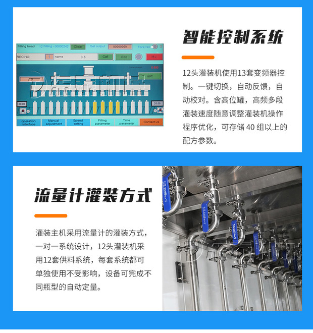 1.智能控制系統(tǒng),12頭灌裝機(jī)使用13套變頻器控制。一鍵切換,自動(dòng)反饋,自動(dòng)校對(duì)。