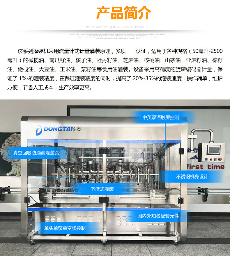 該食用油灌裝機(jī)采用流量計(jì)式計(jì)量灌裝原理,多項(xiàng)認(rèn)證,適用于各種規(guī)格(1-5升)的南瓜籽油、榛子油、牡丹籽油、芝麻油、核桃油、山茶油、亞麻籽油、棉籽油、橄欖油、大豆油、玉米油、菜籽油等食用油灌裝。設(shè)備采用高精的旋轉(zhuǎn)編碼器計(jì)量,保證了1%o的灌裝精度,在保證灌裝精度的同時(shí),提高了20%-35%的灌裝速度,操作簡(jiǎn)單,維護(hù)方便,節(jié)省人工成本,生產(chǎn)效率更高。