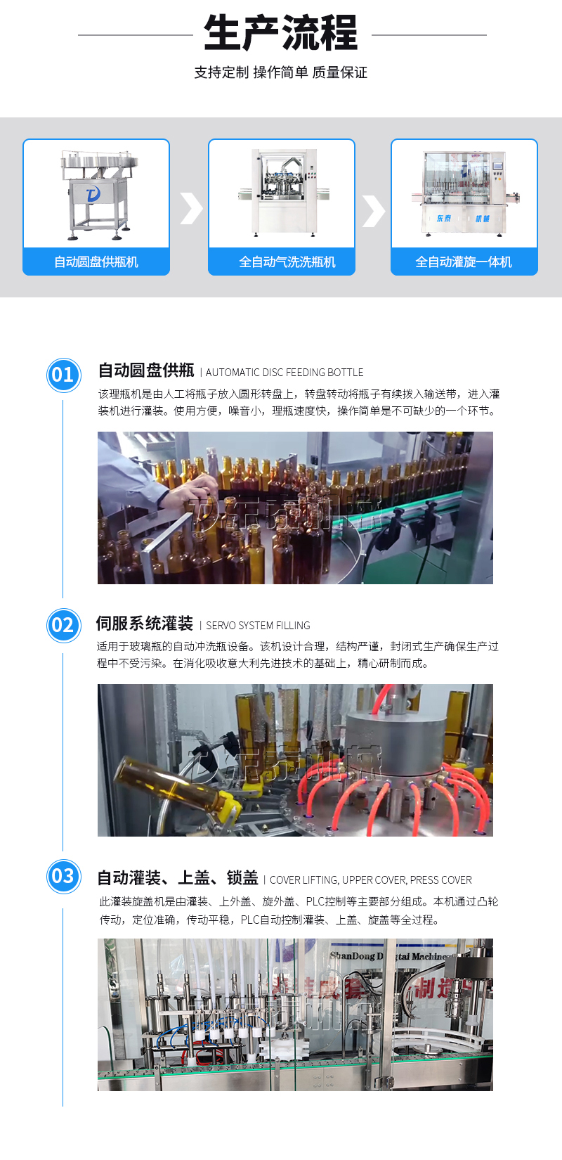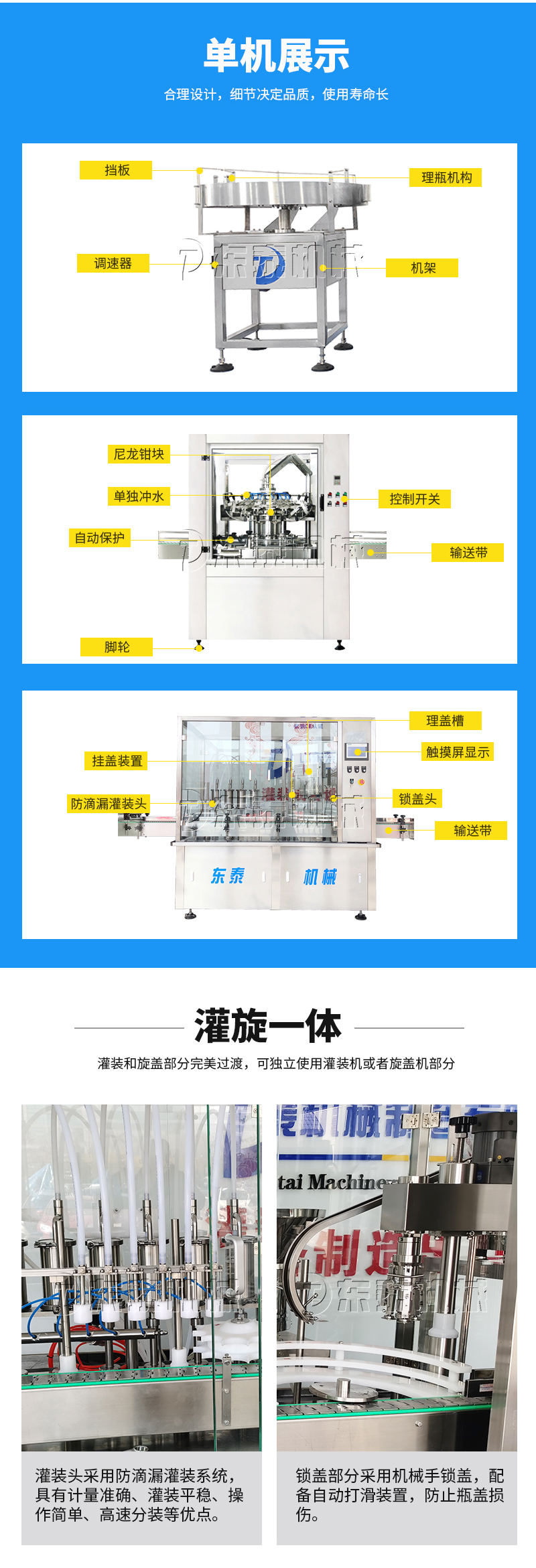 1、本橄欖油灌裝旋蓋機(jī)生產(chǎn)線采用機(jī)械手旋蓋,配備自動(dòng)打滑裝置,防止瓶蓋損傷。